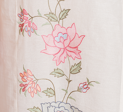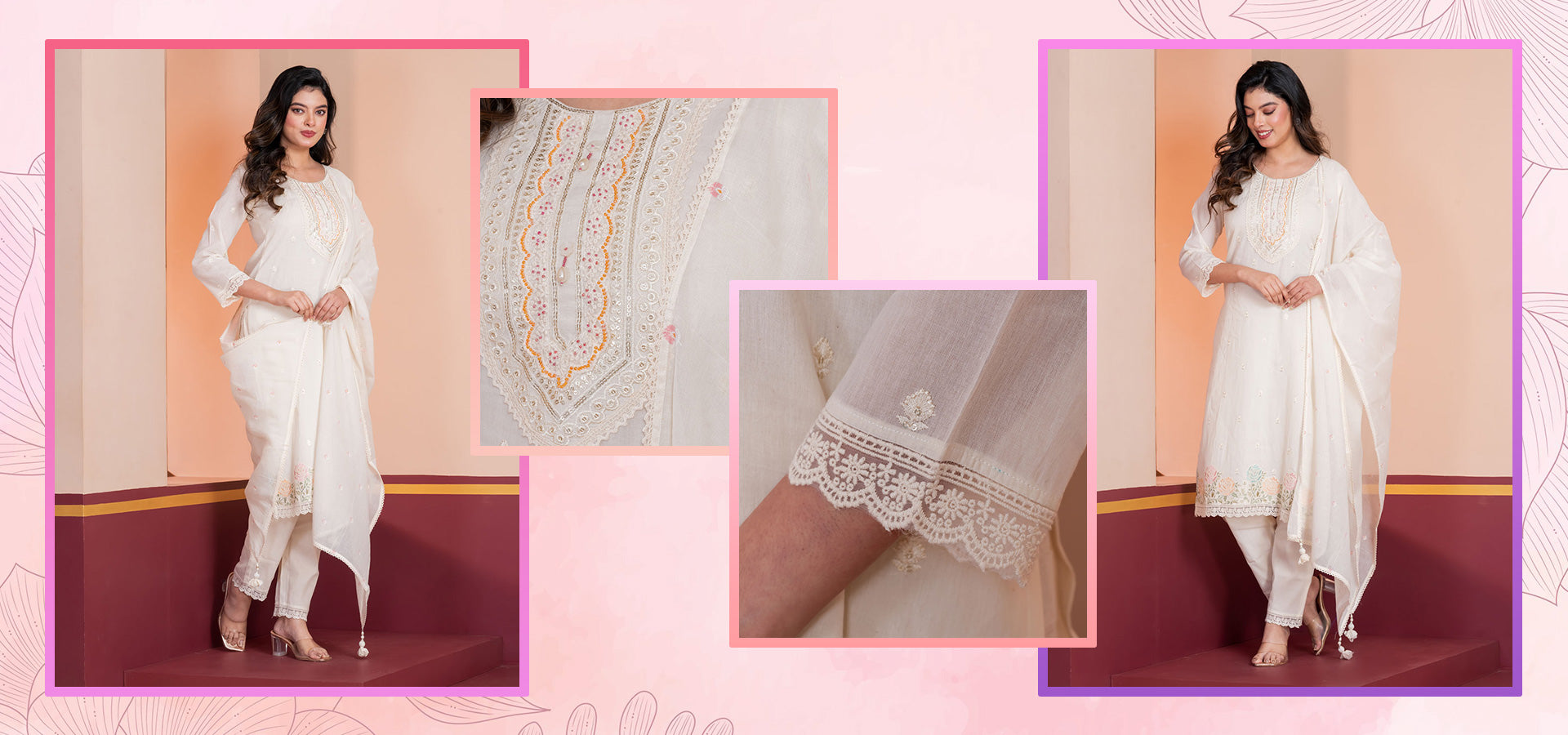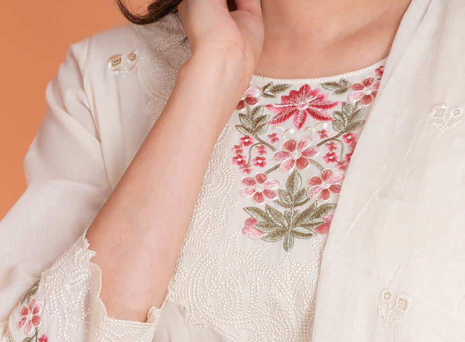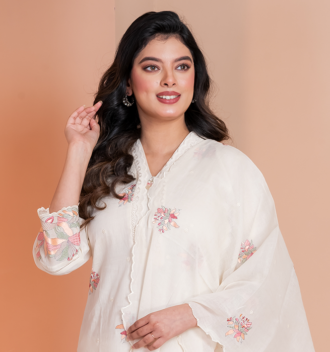 MALKORA IVORY COTTON MULMUL SUIT SET WITH PASTEL FLORAL EMBROIDERY & SCALLOP DETAILING