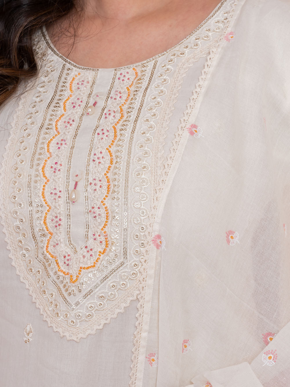 Elevate your everyday elegance with our Pure Cotton Mulmul Kurti Set in a refined off-white shade. The straight-fit kurti is beautifully adorned with multi-colour viscose thread embroidery and enhanced with delicate lace detailing, offering a soft yet sophisticated look. The set includes perfectly tailored pants featuring a right-side pocket and a left-side zipper for comfort and ease of wear. A finely embroidered dupatta, finished with premium lace accents, completes the ensemble with a graceful touch.