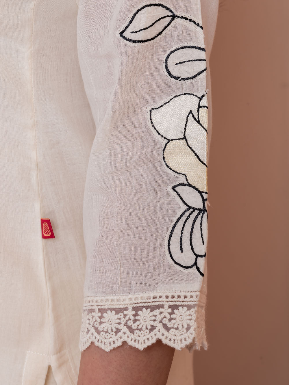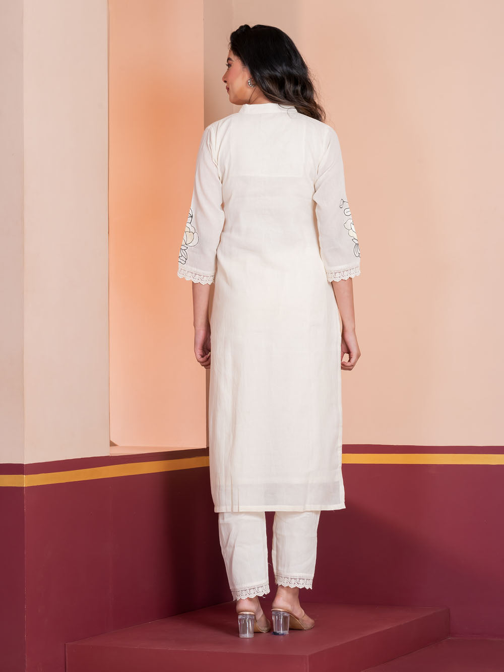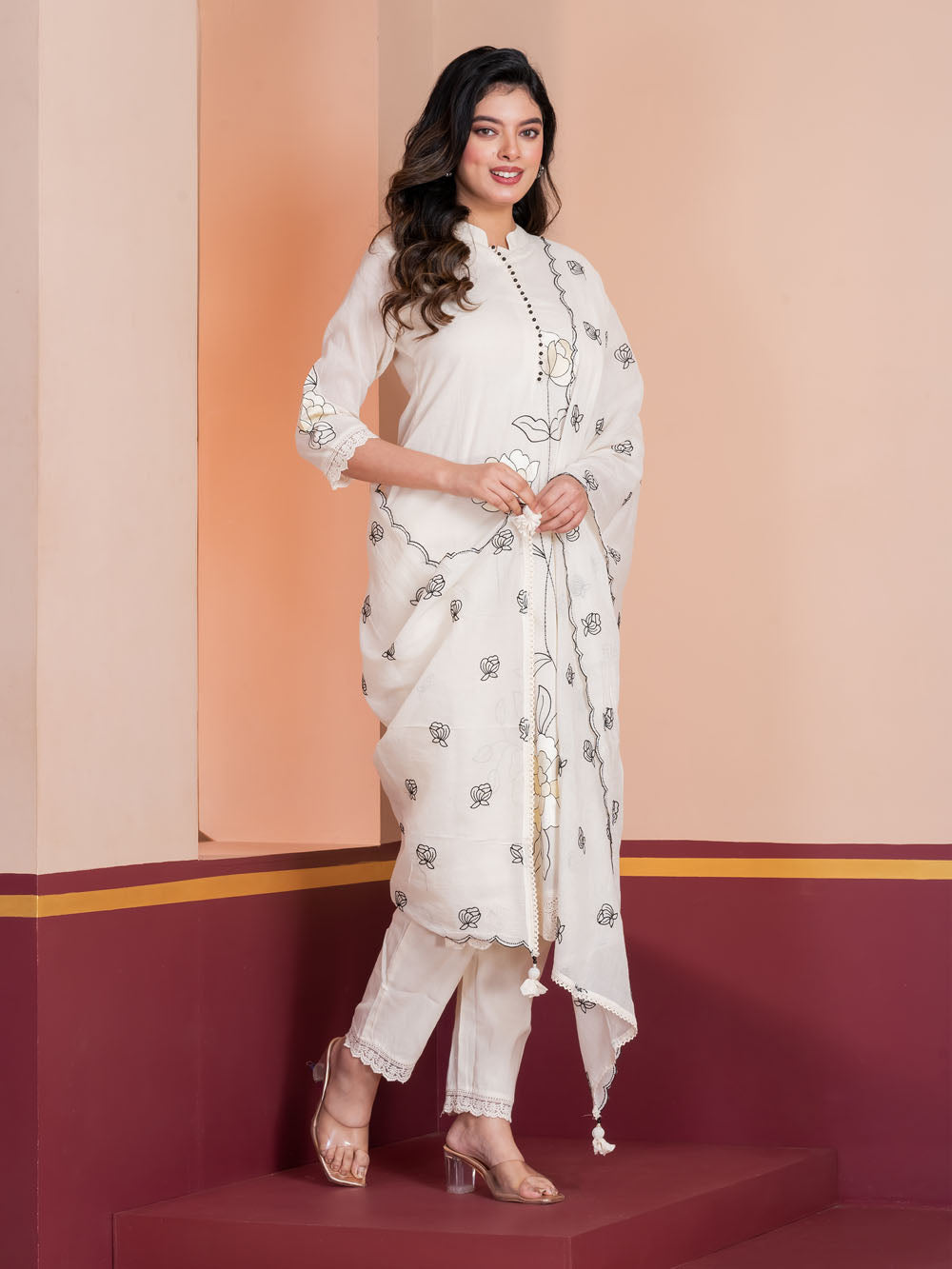 Elevate your everyday elegance with our Pure Cotton Mulmul Kurti Set in a refined off-white shade. The straight-fit kurti is beautifully adorned with multi colour viscose thread embroidery and enhanced with delicate lace detailing, offering a soft yet sophisticated look. The set includes perfectly tailored pants featuring a right-side pocket and a left-side zipper for comfort and ease of wear. A finely embroidered dupatta, finished with premium lace accents, completes the ensemble with a graceful touch.