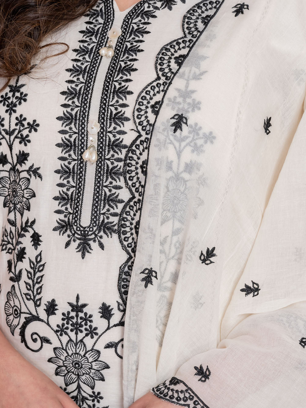 Elevate your everyday elegance with our Pure Cotton Mulmul Kurti Set in a refined off-white shade. The straight-fit kurti is beautifully adorned with black viscose thread embroidery and enhanced with delicate lace detailing, offering a soft yet sophisticated look. The set includes perfectly tailored pants featuring a right-side pocket and a left-side zipper for comfort and ease of wear. A finely embroidered dupatta, finished with premium lace accents, completes the ensemble with a graceful touch.