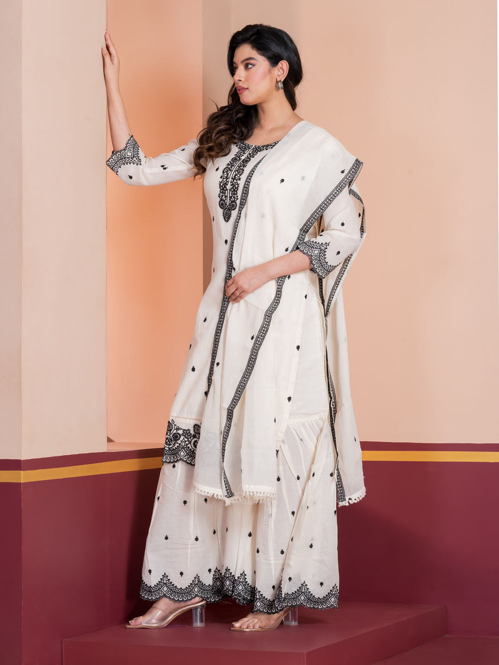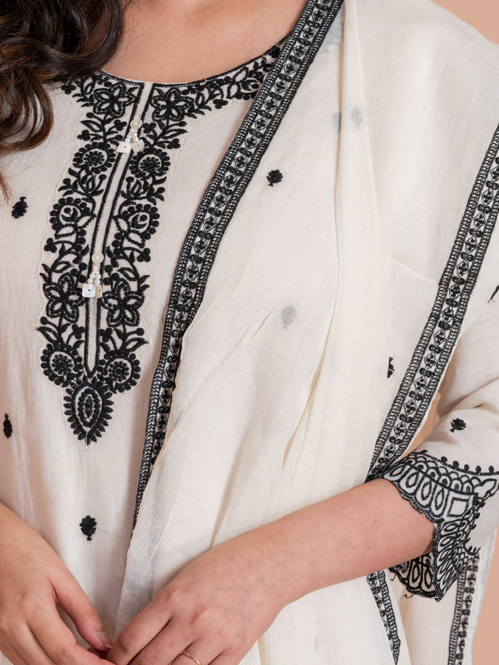 Elevate your everyday elegance with our Pure Cotton Mulmul Kurti Set in a refined off-white shade. The straight-fit kurti is beautifully adorned with black viscose thread embroidery and enhanced with delicate lace detailing, offering a soft yet sophisticated look. The set includes perfectly tailored sharara. A finely embroidered dupatta, finished with premium lace accents, completes the ensemble with a graceful touch.